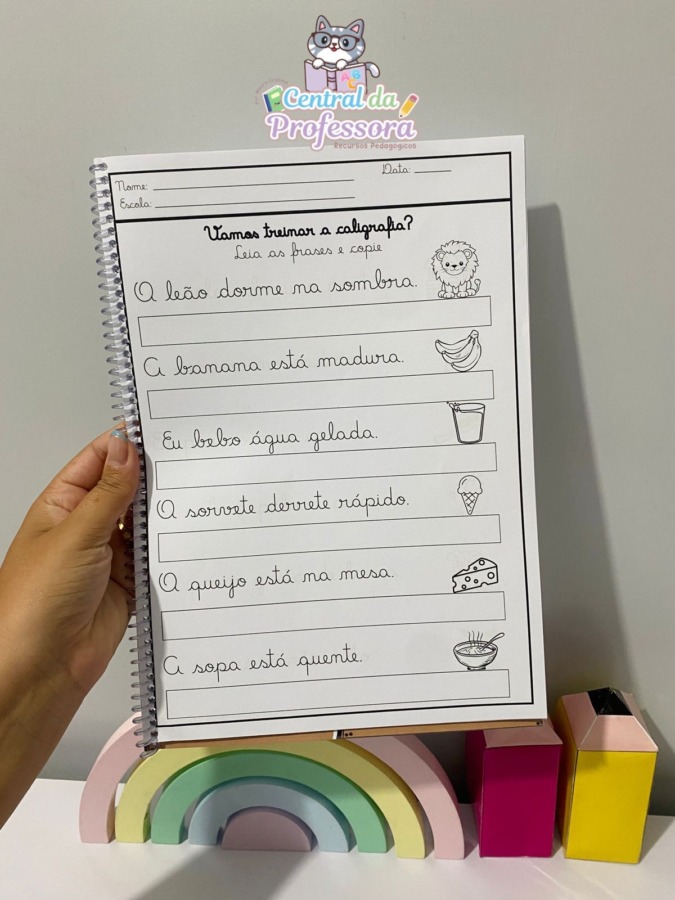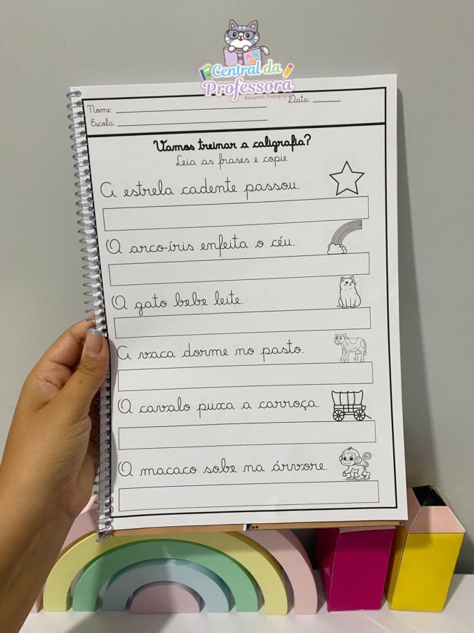 ✏ Contém diversas frases simples e ilustrativas para copiar, reforçando a leitura, a atenção e a prática da caligrafia.