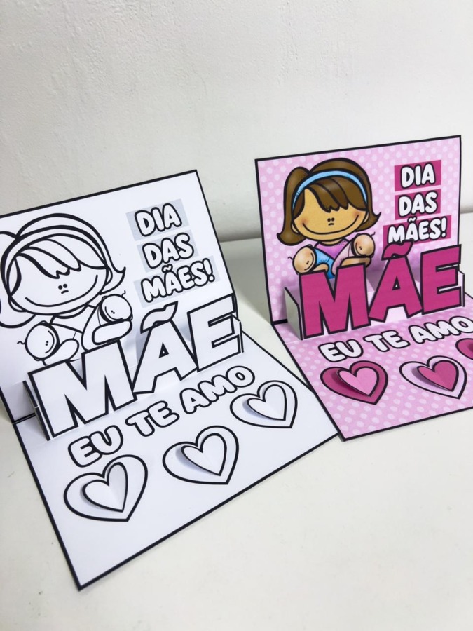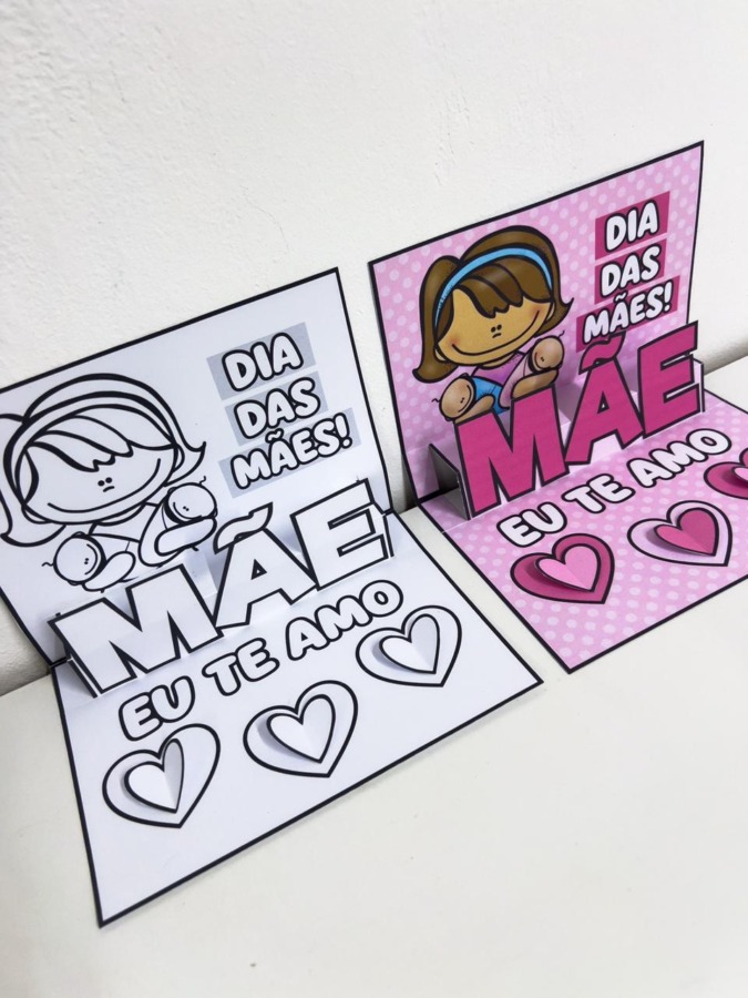 Este material pedagógico é um encantador cartão 3D para o Dia das Mães, ideal para trabalhar criatividade e afeto com as crianças. Ao montar o cartão, forma-se um efeito tridimensional com a palavra “MÃE” em destaque, acompanhada de uma ilustração fofa e da frase “Eu te amo”, além de corações decorativos.