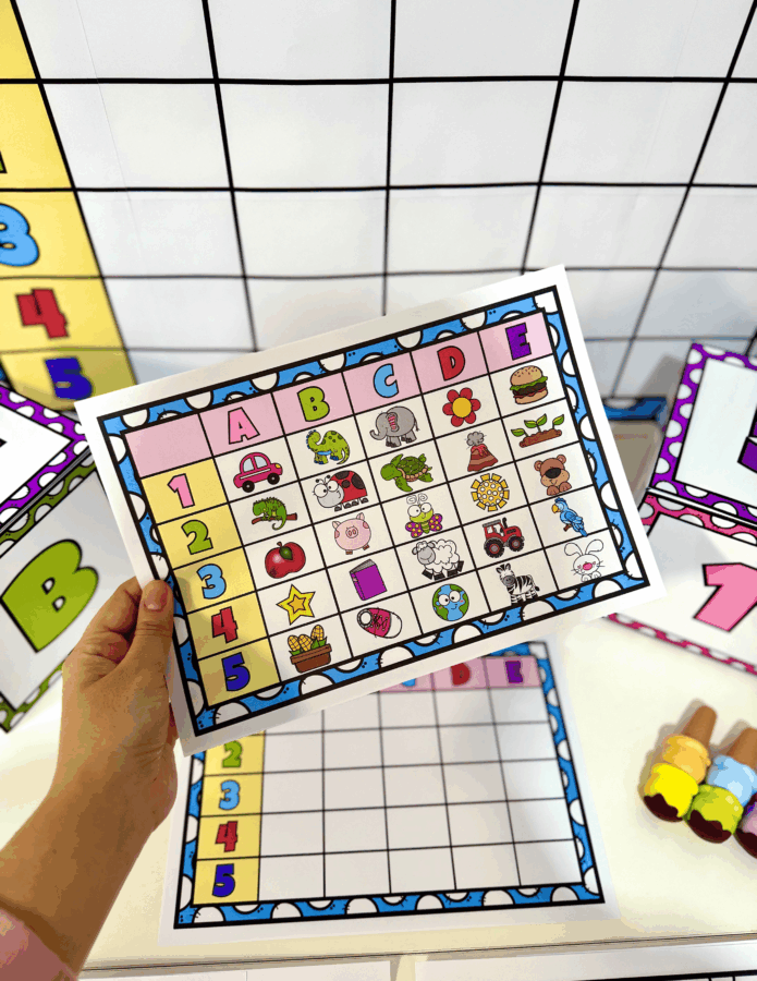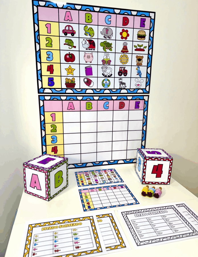 Nessa proposta a criança deverá jogar os dados, identificar a figura que se encontrana linha ena coluna sorteada e realizar a escritada palavra na tabela em branco. O material também acompanha folhas de registro na opção colorida e para colorir e as tabelas na opção A4. No total a tabela inclui 25 figuras diferentes.