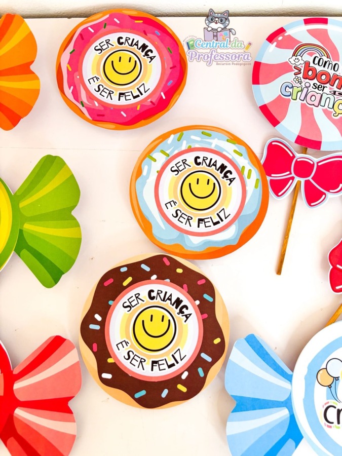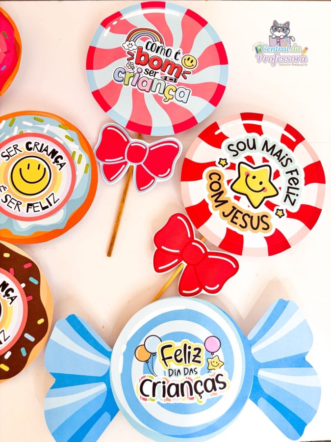 Preparei um material incrível de lembrancinhas com guloseimas, em três versões encantadoras: pirulito, bala e donuts e com 14 variações🍭🍬🍩.