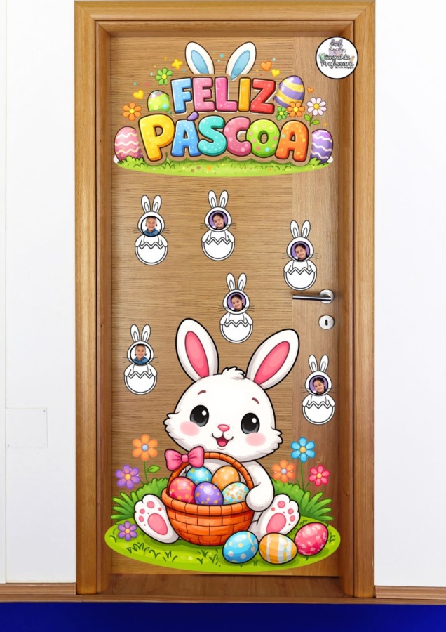 Deixe sua sala ainda mais encantadora nesta Páscoa com um painel interativo para porta ou parede! Os coelhinhos permitem que as crianças desenhem o rostinho ou edição com foto, tornando a atividade divertida, afetiva e cheia de significado.
