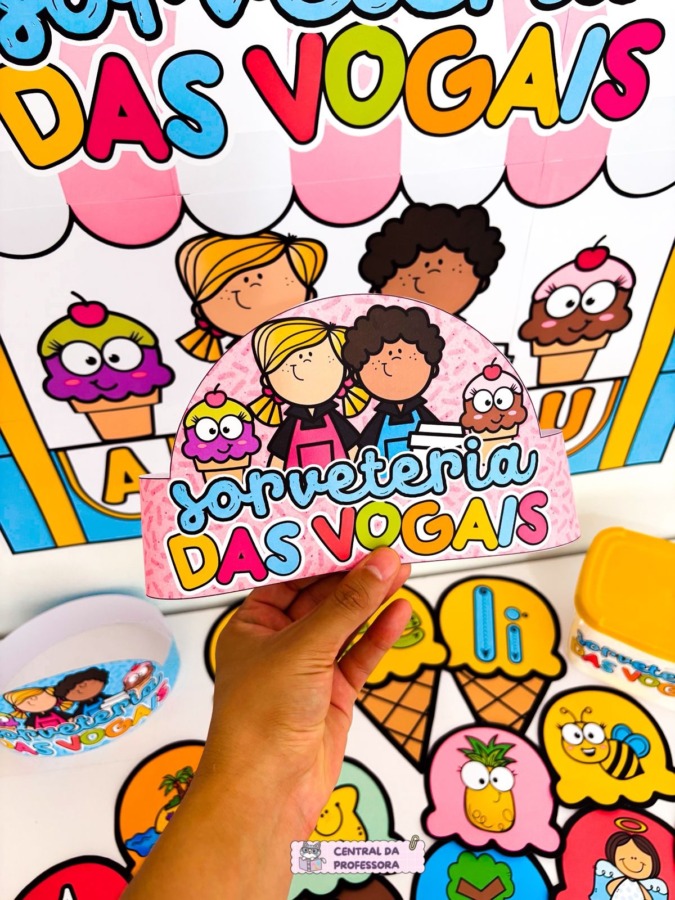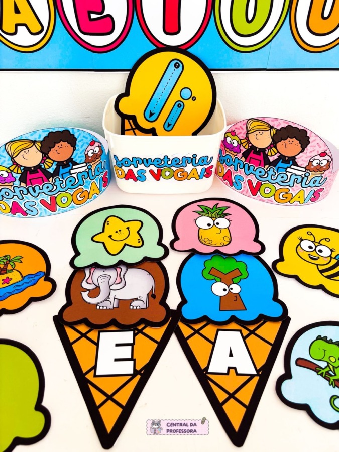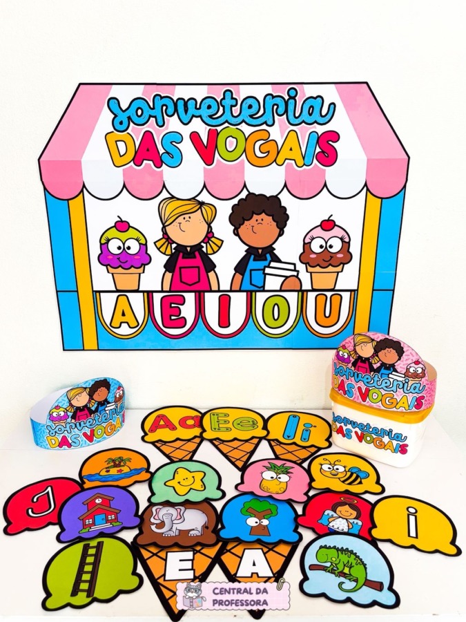 O material inclui atividades com cones e “sabores” interativos, painel temático que simula uma sorveteria e rótulos para organização dos recursos.