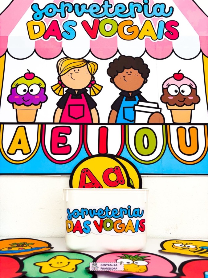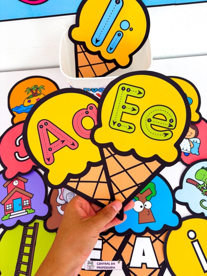 A proposta torna o ensino das vogais mais leve e lúdico, permitindo que a criança aprenda brincando. Trabalha identificação da letra inicial, vogais nas quatro formas, associação entre som e grafia, treino do traçado e formação de palavras.